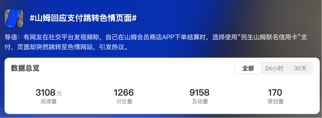 近日,有網友在社交平臺發視頻稱,自己在山姆會員商店APP下單結算時,選擇使用“民生山姆聯名信用卡”支付,頁面卻突然跳轉至色情網站,引發熱議。