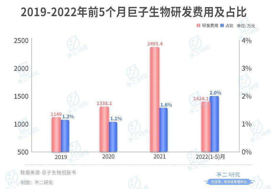 招股書顯示,截至 2022 年 5 月 31 日,巨子生物研發團隊為 124 人,占總人數的 14.8%。2019-2021 年及 2022 年前 5 個月,巨子生物研發費用分別為 1140 萬、1338.1 萬、2495.4 萬及 1424.1 萬,在總收入中占比分別為 1.2%、1.1%、1.6% 和 2.0%。