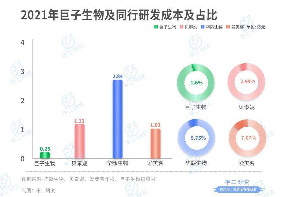 雖然 " 重營銷輕研發 " 已成行業通病,但巨子生物的研發投入在同行中也略顯遜色。年報數據顯示,2021 年華熙生物研發投入 2.84 億元,占營收的比例為 5.75%;愛美客(300896.SZ)研發費用支出 1.02 億元,占營收 7.07%;貝泰妮的研發費用為 1.13 億元,占營收 2.99%。