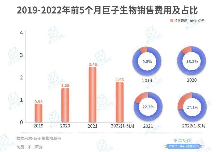 巨子生物在招股書中解釋稱,凈利率的走低歸因于線上營銷開支的增加。2019-2021 年及 2022 年前 5 個月,公司銷售費用分別為 0.94 億、1.58 億、3.46 億和 1.96 億,占營業收入比重分別為 9.8%、13.3%、22.3% 和 27.1%。