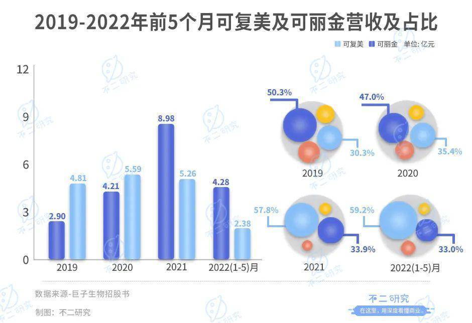 可復美和可麗金是巨子生物的兩張 " 王牌 "。招股書顯示,2019-2021 年及 2022 年前 5 個月,可復美收入分比為 2.90 億、4.21 億、8.98 億和 4.28 億,占總收入比重分別為 30.3%、35.4%、57.8% 和 59.2%;可麗金收入分別為 4.81 億、5.59 億、5.26 億和 2.38 億,占總收入比重分別為 50.3%、47.0%、33.9% 和 33.0%。