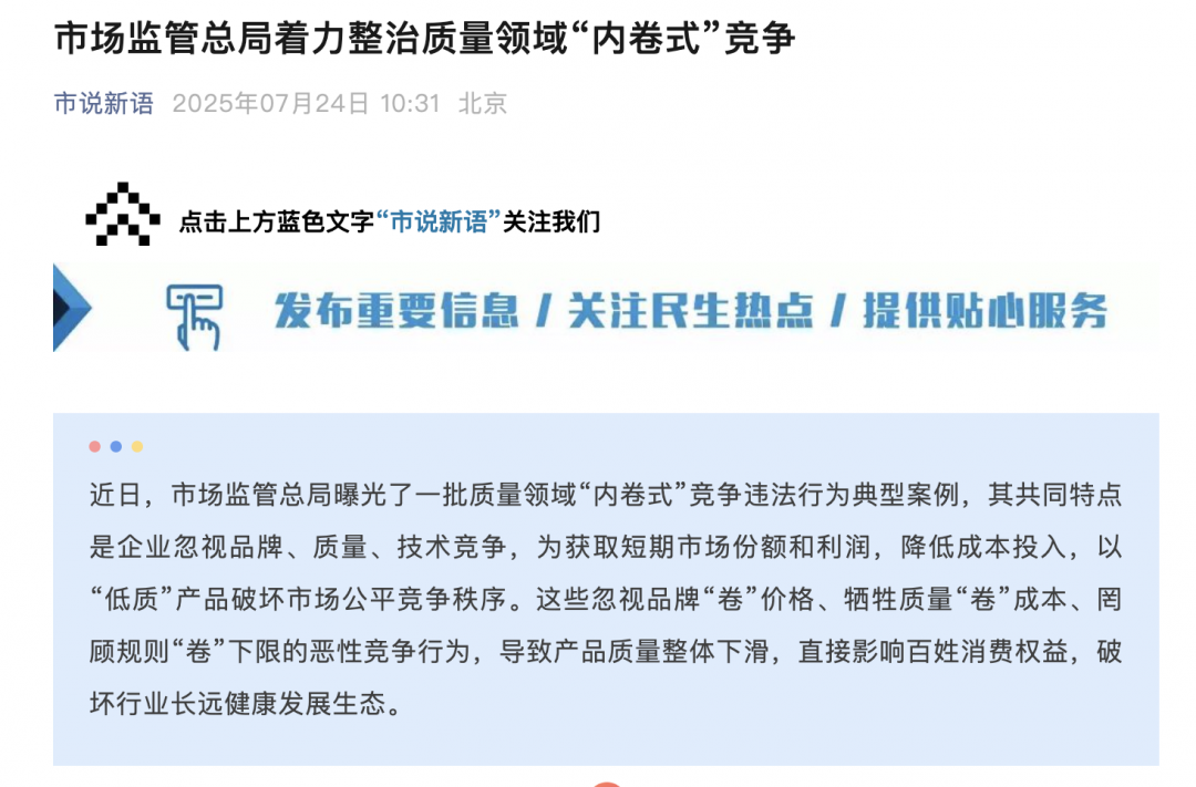 市場監管總局指出,這些忽視品牌“卷”價格、犧牲質量“卷”成本、罔顧規則“卷”下限的惡性競爭行為,導致產品質量整體下滑,直接影響百姓消費權益,破壞行業長遠健康發展生態。