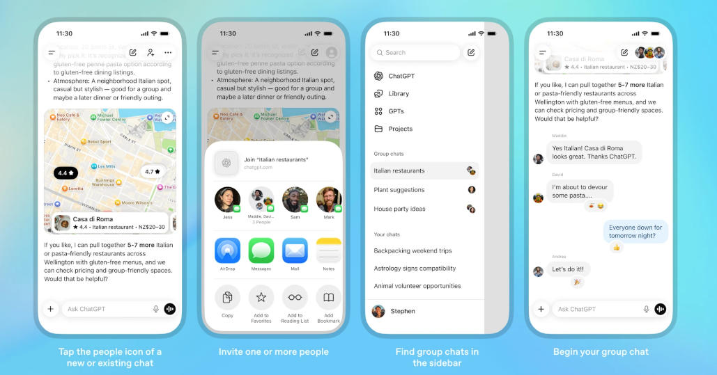 OpenAI將此功能定位為與朋友、家人或同事協作的方式,用于組織聚餐、制定旅行計劃和起草大綱等事務——所有這些都由ChatGPT參與。