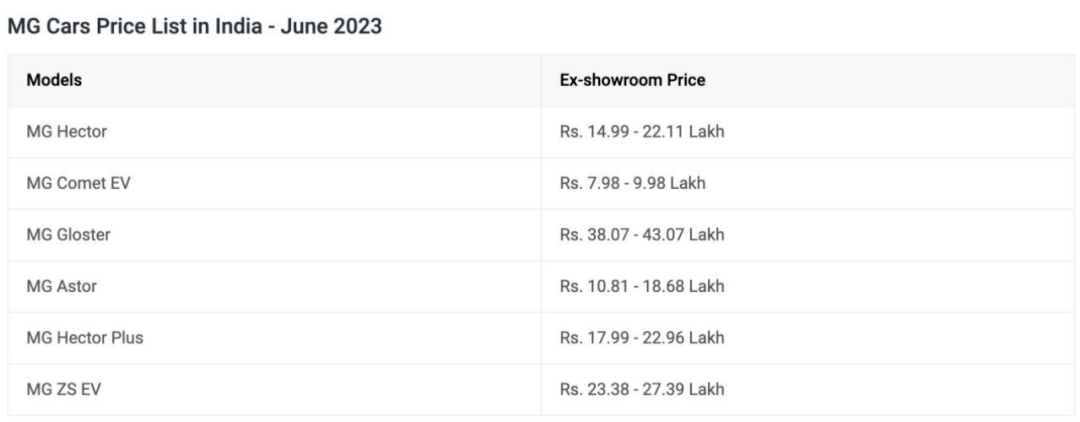 ▲ 名爵印度公司的六款車型圖源:印度汽車資訊網站zigwheels