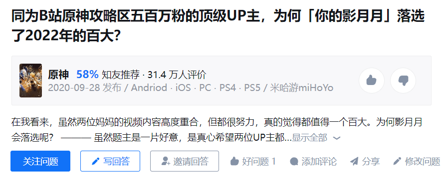 但另一批網友則是完全不能理解,有人認為其他區更值得關注, “ 原神區 ” 不應該占百大名額。