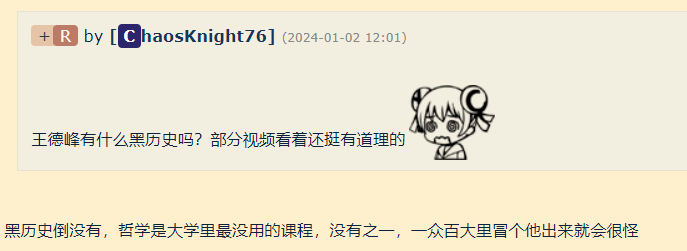 同樣的事情可以復刻到絕大多數百大 up 身上,比如哲學教授王德峰,喜歡的網友在喊 “ 我的寶藏 up 被發現了 ” ,但另外一些不支持的網友,理由也是五花八門。